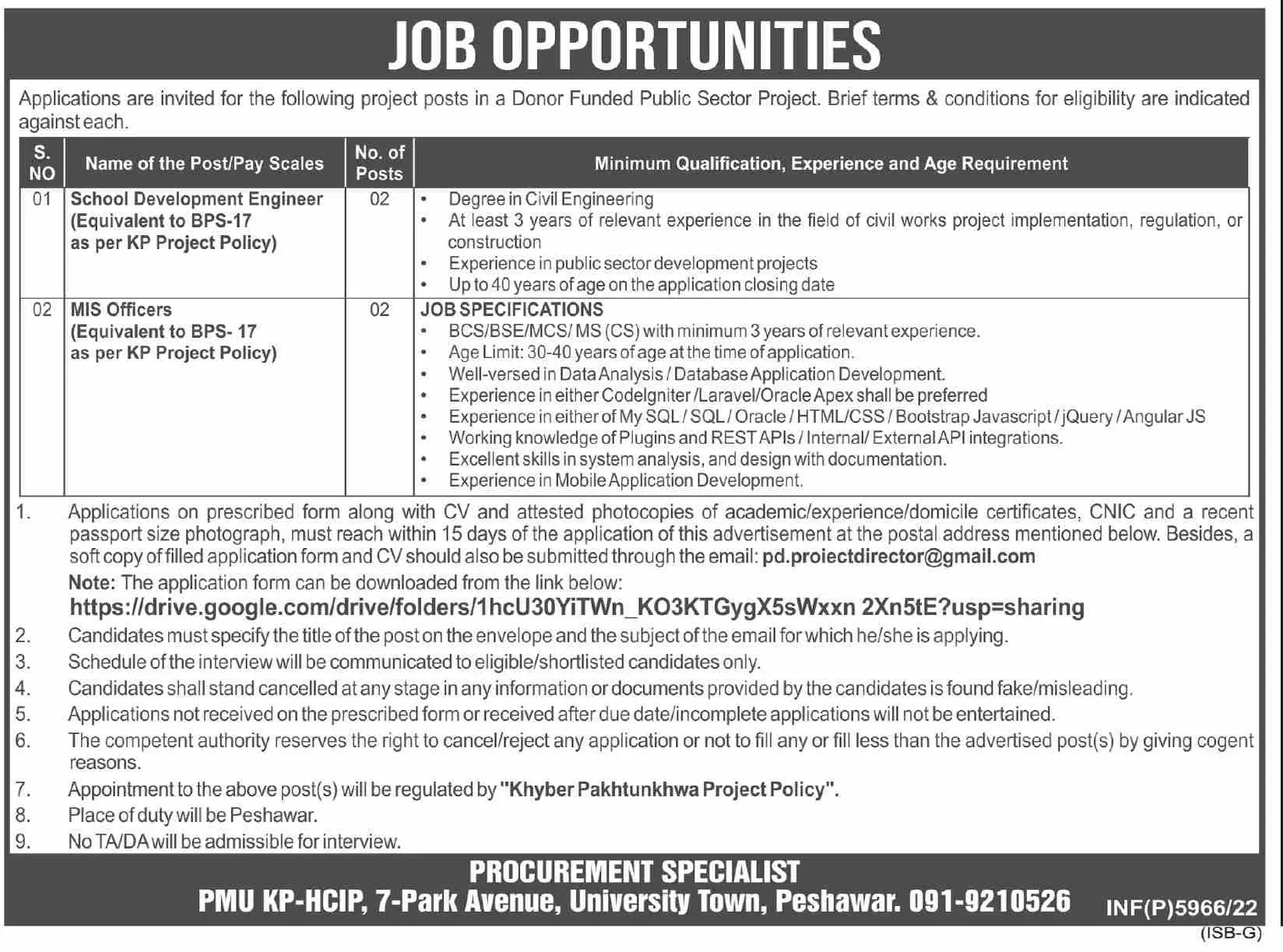 - Donor funded public sector project offers vacancies for the posts of School Development Engineers, MIS Officers.
