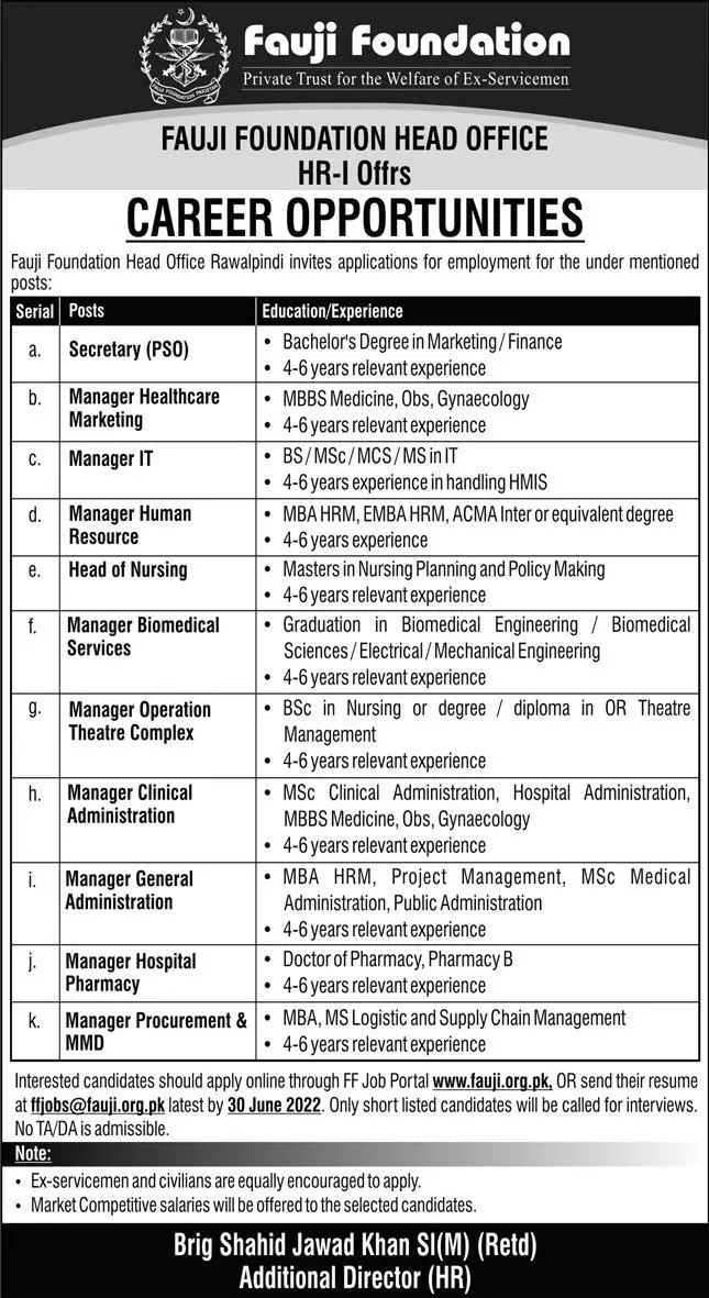 Jobs In Fauji Foundation Rawalpindi Punjab announce the Contract career opportunities for the post of See Below Ad in Punjab, Rawalpindi for the fresh and experienced candidates on Contract basis who have Check Advertisement degree. Posted date of this post is 19/06/2022 and the last date is 30/06/2022. if you are eligible for this job apply before due date.