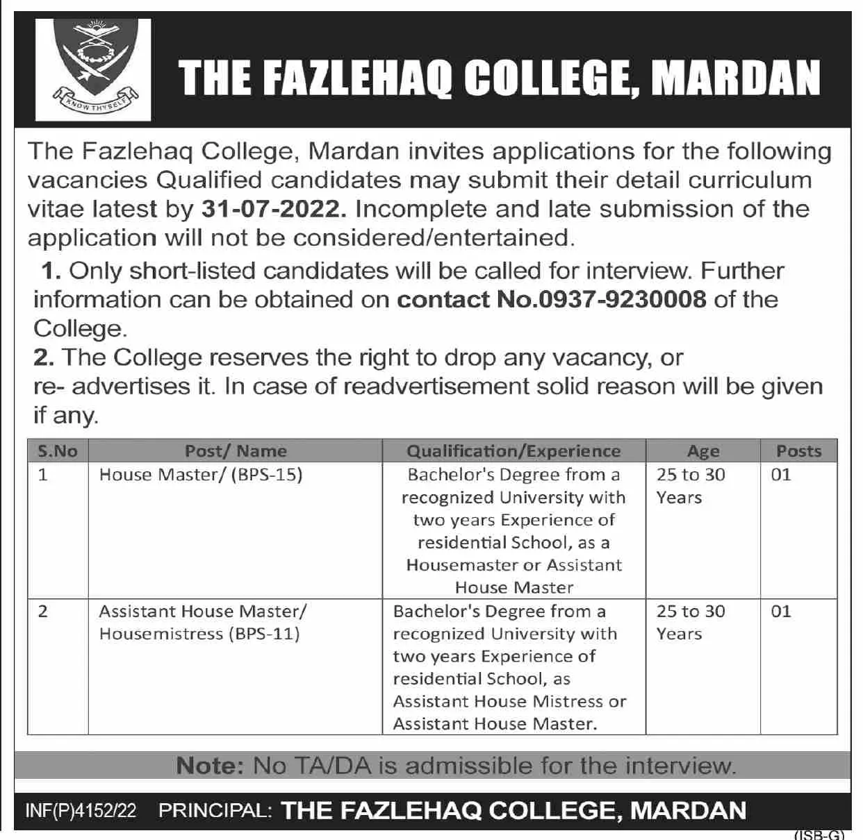 Jobs in Fazlehaq College Mardan 2022 announce the Contract career opportunities for the post of See Below Ad in Khyber Pakhtunkhwa, Mardan for the fresh and experienced candidates on Contract basis who have Check Advertisement degree. Posted date of this post is 19/07/2022 and the last date is 31/07/2022. if you are eligible for this job apply before due date.
