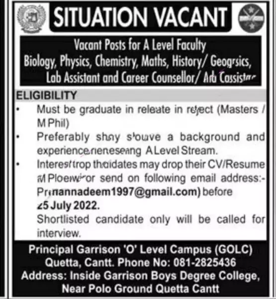 Jobs in Garrison O Level Campus Quetta Cantt 2022 announce the Contract career opportunities for the post of See Below Ad in Balochistan, Quetta for the fresh and experienced candidates on Contract basis who have Check Advertisement degree. Posted date of this post is 17/07/2022 and the last date is 25/07/2022. if you are eligible for this job apply before due date.