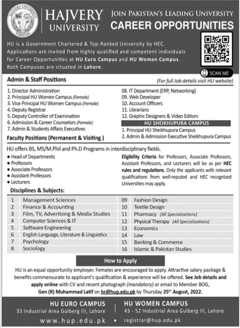 Jobs in Hajvery University Lahore Punjab announce the Contract career opportunities for the post of See Below Ad in Punjab, Lahore for the fresh and experienced candidates on Contract basis who have Check Advertisement degree. Posted date of this post is 07/08/2022 and the last date is 25/08/2022. if you are eligible for this job apply before due date.