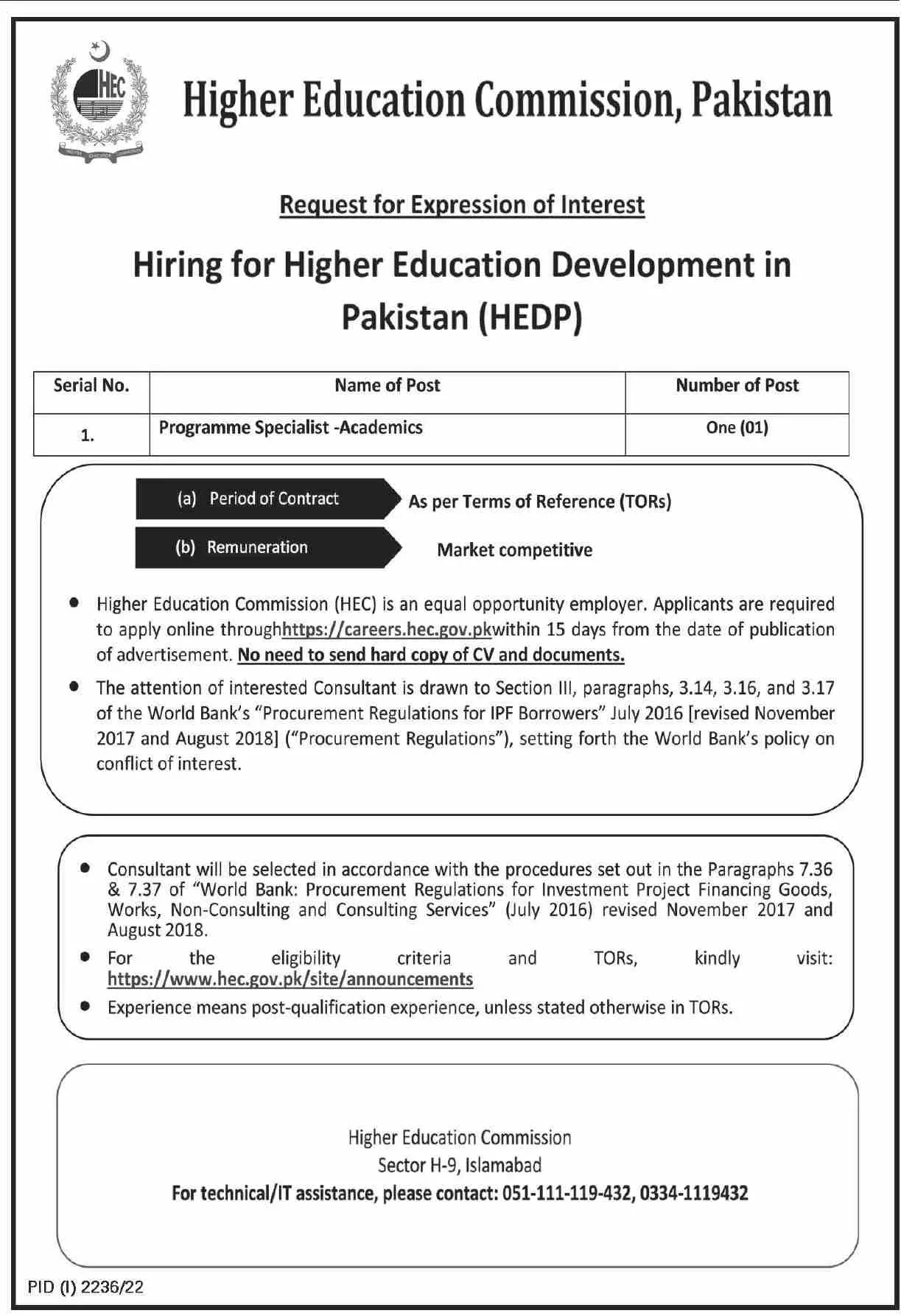 - Vacant posts including program specialist are announced in Higher Education Commission HEC Islamabad, islamabad Islamabad Pakistan as per 9 October 2022 advertisement in daily Jang Newspaper. Persons with Phd and Mphil etc. education can apply.