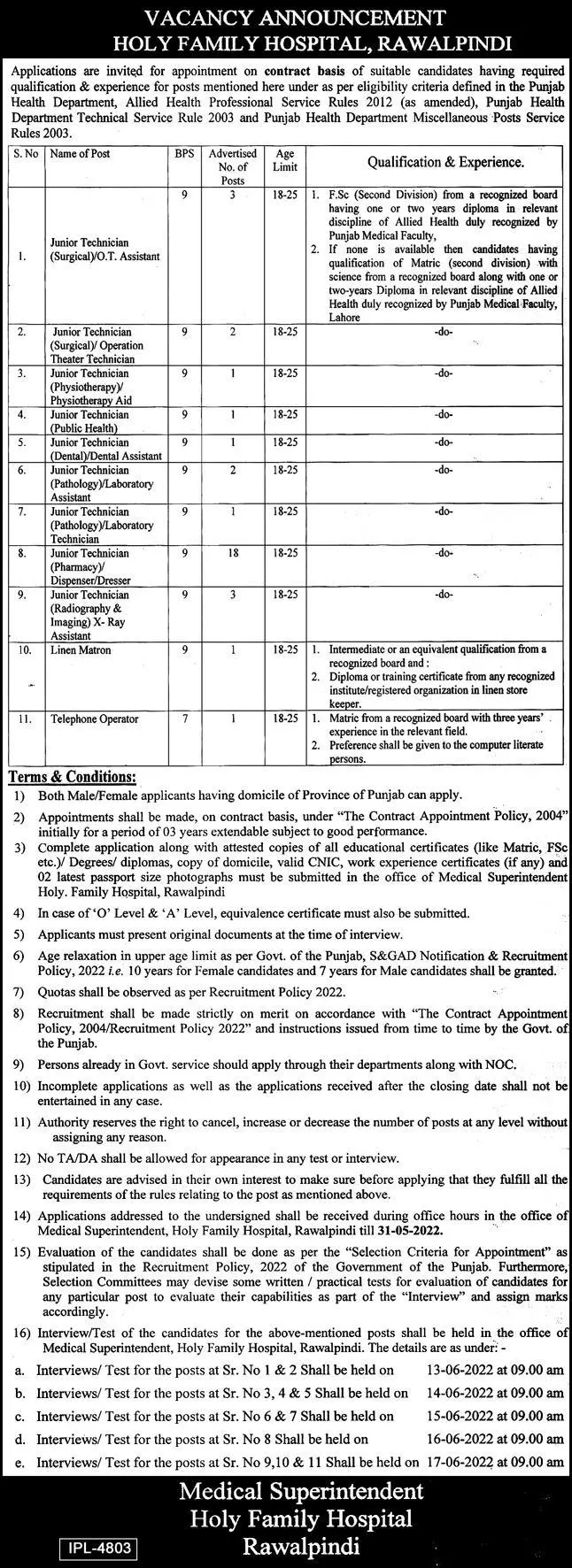 Jobs In Holy Family Hospital Rawalpindi announce the Contract career opportunities for the post of See Below Ad in Punjab, Rawalpindi for the fresh and experienced candidates on Contract basis who have Check Advertisement degree. Posted date of this post is 10/05/2022 and the last date is 31/05/2022. if you are eligible for this job apply before due date.