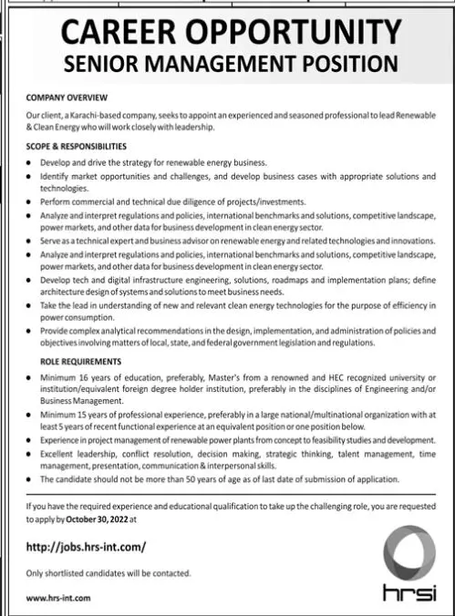 Jobs in Human Resource Solutions International - HRSI announce the Contract career opportunities for the post of See Below Ad in Sindh, Karachi for the fresh and experienced candidates on Contract basis who have Check Advertisement degree. Posted date of this post is 16/10/2022 and the last date is 30/10/2022. if you are eligible for this job apply before due date.
