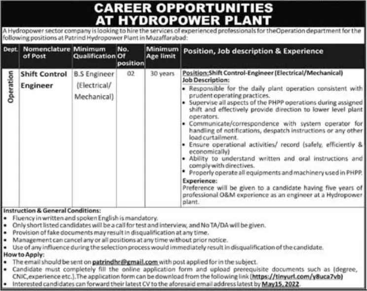 Jobs In Hyropower Sector Company announce the Contract career opportunities for the post of See Below Ad in Azad Jammu Kashmir, Muzaffarabad for the fresh and experienced candidates on Contract basis who have Check Advertisement degree. Posted date of this post is 08/05/2022 and the last date is 15/05/2022. if you are eligible for this job apply before due date.