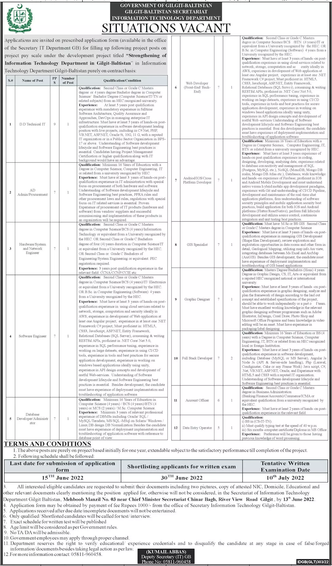 Jobs in information Technology Department Gilgit -Baltistan announce the Contract career opportunities for the post of See Below Ad in Gilgit Baltistan for the fresh and experienced candidates on Contract basis who have Check Advertisement degree. Posted date of this post is 21/05/2022 and the last date is 15/05/2022. if you are eligible for this job apply before due date.