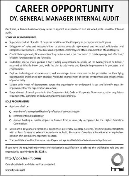 Jobs in Karachi Based Company announce the Contract career opportunities for the post of See Below Ad in Sindh, Karachi for the fresh and experienced candidates on Contract basis who have Check Advertisement degree. Posted date of this post is 05/06/2022 and the last date is 26/06/2022. if you are eligible for this job apply before due date.