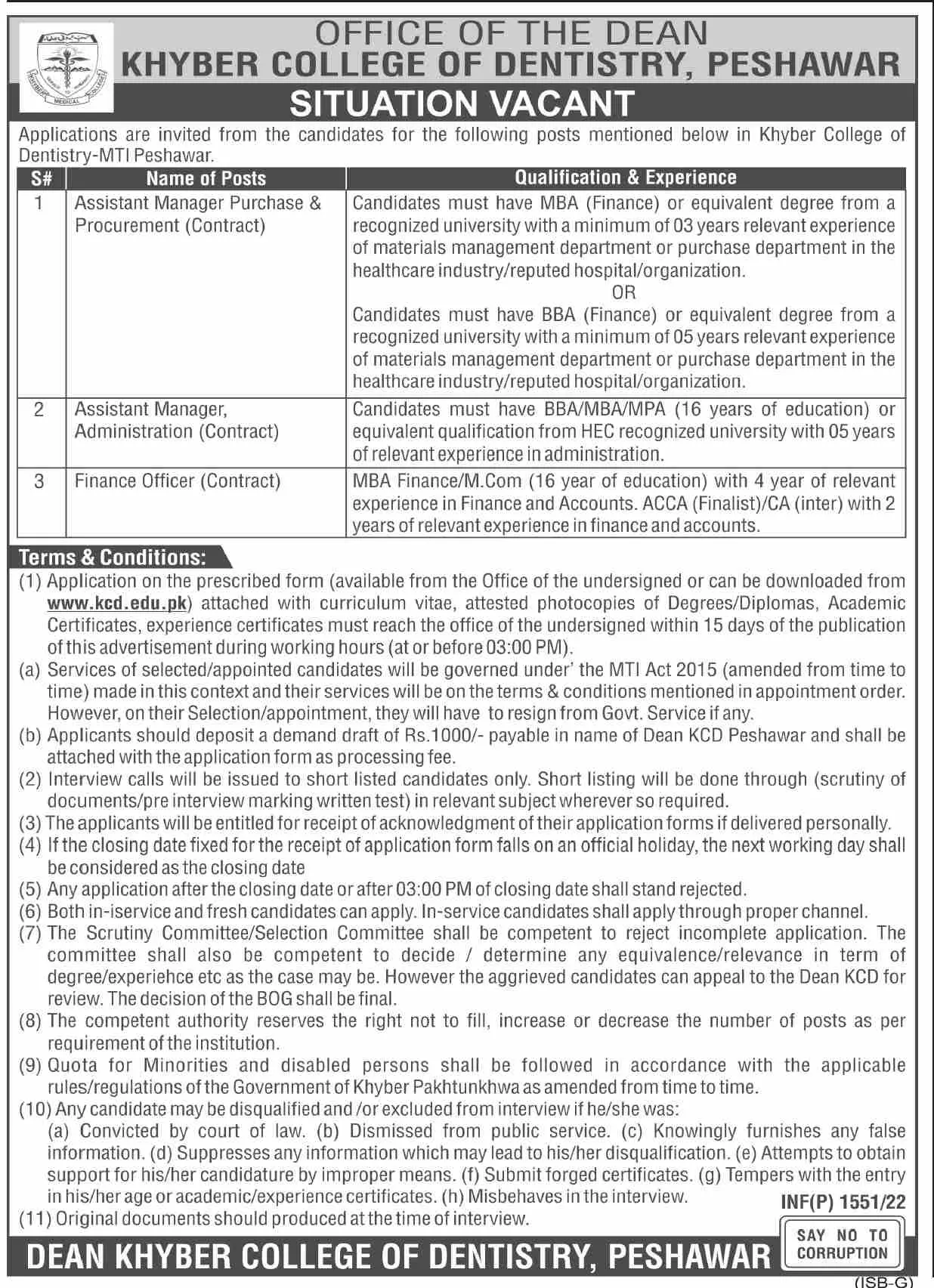 Jobs In Khyber College of Dentistry announce the Contract career opportunities for the post of See Below Ad in Khyber Pakhtunkhwa, Peshawar for the fresh and experienced candidates on Contract basis who have Check Advertisement degree. Posted date of this post is 16/03/2022 and the last date is 31/03/2022. if you are eligible for this job apply before due date.