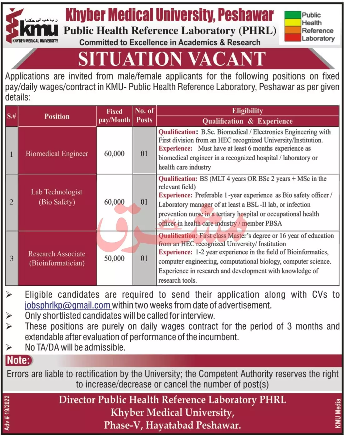 Jobs in Khyber Medical University Peshawar announce the Adhoc career opportunities for the post of See Below Ad in Khyber Pakhtunkhwa, Peshawar for the fresh and experienced candidates on Adhoc basis who have Check Advertisement degree. Posted date of this post is 03/06/2022 and the last date is 17/06/2022. if you are eligible for this job apply before due date.