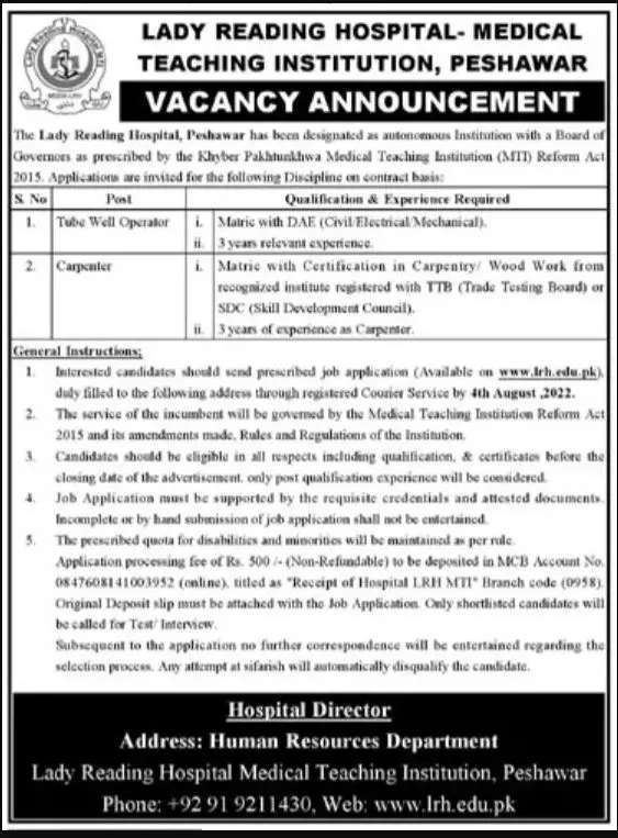 Desired persons can address their applications to the Hospital Director, HR Department, Lady Reading Hospital, MTI, Peshawar.