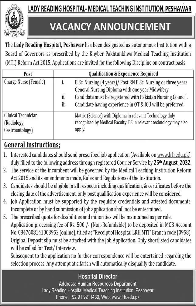 Desired persons can address their applications to the Hospital Director, HR Department, Lady Reading Hospital, MTI, Peshawar.