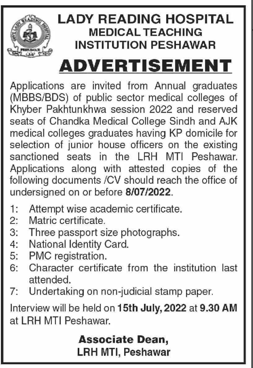 Jobs in Lady Reading Hospital MTI Peshawar announce the Contract career opportunities for the post of See Below Ad in Khyber Pakhtunkhwa, Peshawar for the fresh and experienced candidates on Contract basis who have Check Advertisement degree. Posted date of this post is 30/06/2022 and the last date is 08/07/2022. if you are eligible for this job apply before due date.