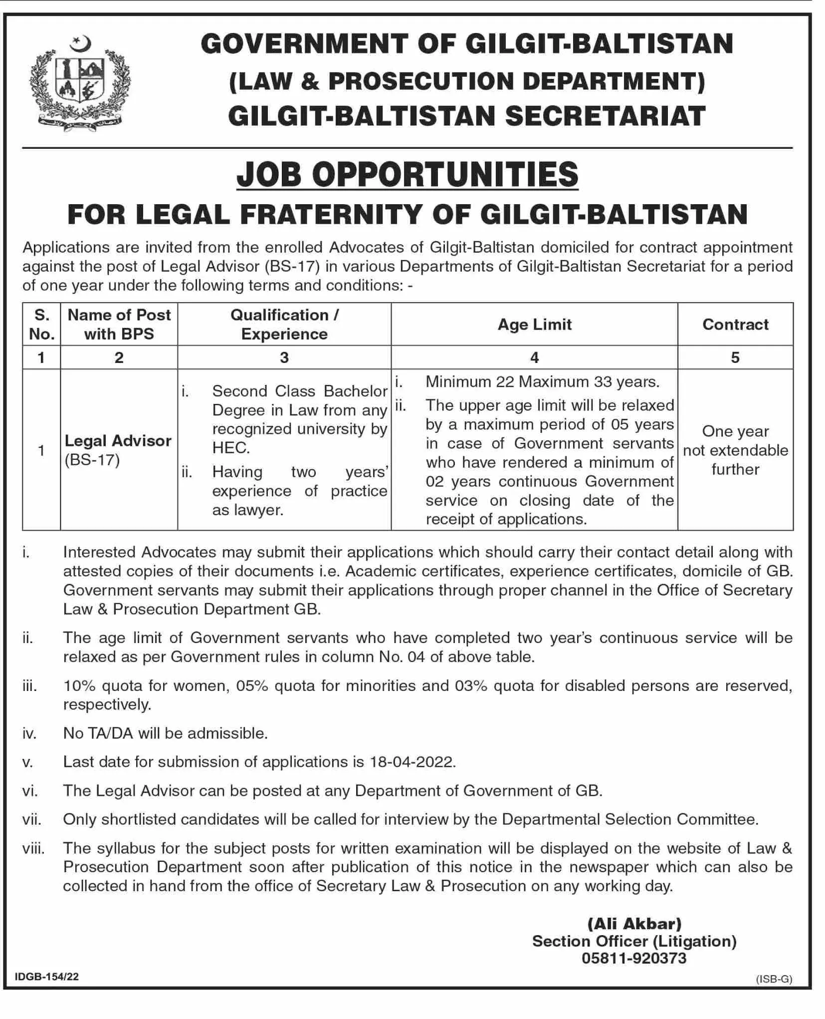 Jobs In Law & Prosecution Department Gilgit Baltistan announce the Contract career opportunities for the post of See Below Ad in Gilgit Baltistan for the fresh and experienced candidates on Contract basis who have Check Advertisement degree. Posted date of this post is 30/03/2022 and the last date is 18/04/2022. if you are eligible for this job apply before due date.