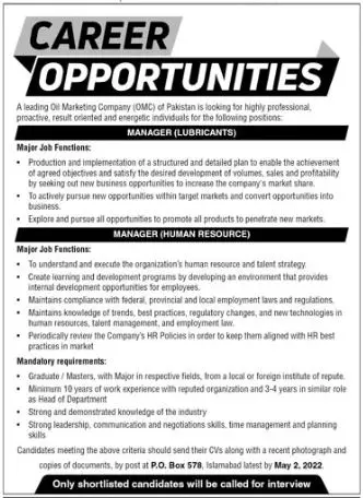 Jobs In Leading Oil Marketing Company announce the Contract career opportunities for the post of See Below Ad in Federal, Islamabad for the fresh and experienced candidates on Contract basis who have Check Advertisement degree. Posted date of this post is 23/04/2022 and the last date is 02/05/2022. if you are eligible for this job apply before due date.