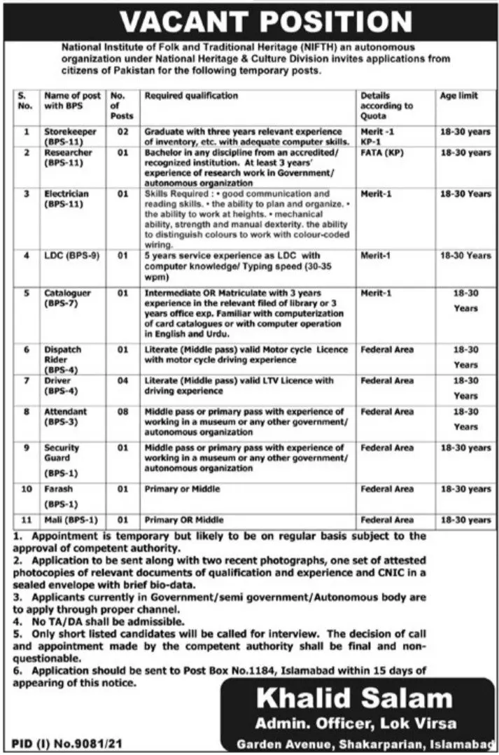 Jobs in National institute of Folk And Traditional Heritage announce the Contract career opportunities for the post of See Below Ad in Federal, Islamabad for the fresh and experienced candidates on Contract basis who have Check Advertisement degree. Posted date of this post is 30/06/2022 and the last date is 15/07/2022. if you are eligible for this job apply before due date.