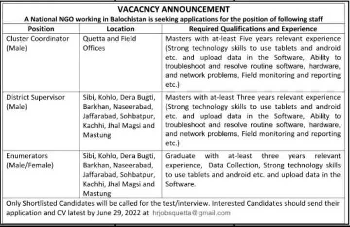 Jobs in National NGO Balochistan 2022 announce the Contract career opportunities for the post of See Below Ad in Balochistan, Quetta for the fresh and experienced candidates on Contract basis who have Check Advertisement degree. Posted date of this post is 28/06/2022 and the last date is 29/06/2022. if you are eligible for this job apply before due date.