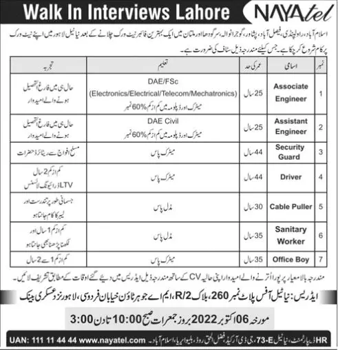 Jobs in Nayatel Pvt Limited Telecom 2022 announce the Contract career opportunities for the post of See Below Ad in Punjab, Rawalpindi for the fresh and experienced candidates on Contract basis who have Check Advertisement degree. Posted date of this post is 02/10/2022 and the last date is 06/10/2022. if you are eligible for this job apply before due date.