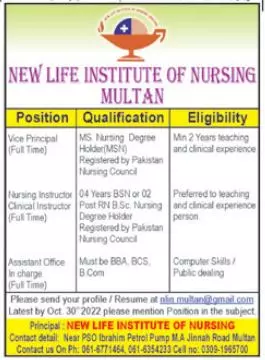 - New Life Institute Of Nursing invites applications for job positions advertised in daily Khabrain dated 11 October 2022 for following vacancies in Multan, multan Punjab Pakistan. nursing instructor assistant office and vice principal Educational qualifications required BBA and B.com etc.