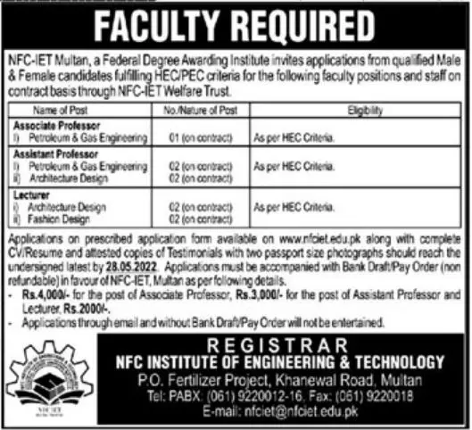 Jobs In NFC Institute of Engineering & Technology Multan announce the Contract career opportunities for the post of See Below Ad in Punjab, Multan for the fresh and experienced candidates on Contract basis who have Check Advertisement degree. Posted date of this post is 10/05/2022 and the last date is 28/05/2022. if you are eligible for this job apply before due date.