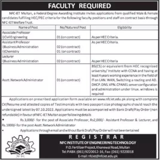 - NFC Institute of Engineering & Technology latest Government Education jobs and others can be applied till 7 October 2022 or as per closing date in newspaper ad.