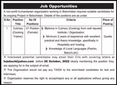 Jobs in Non Profit Humanitarian organization Balochistan announce the Contract career opportunities for the post of See Below Ad in Balochistan, Quetta for the fresh and experienced candidates on Contract basis who have Check Advertisement degree. Posted date of this post is 15/10/2022 and the last date is 20/10/2022. if you are eligible for this job apply before due date.