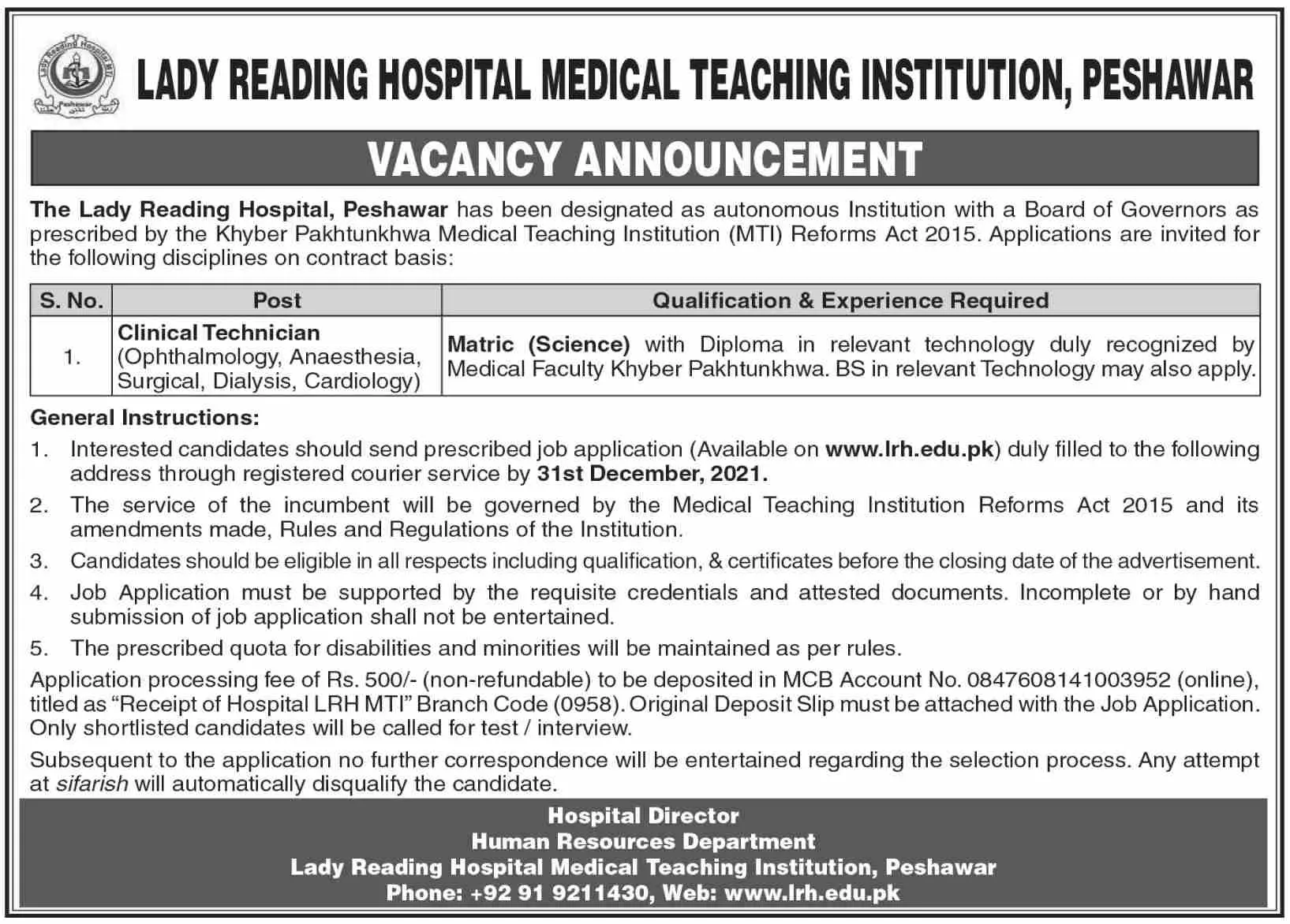 jobs in Pakistan lady reading hospital Peshawar