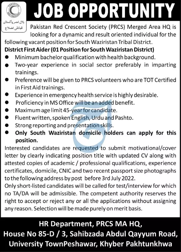 Jobs in Pakistan Red Crescent Society announce the Contract career opportunities for the post of See Below Ad in Khyber Pakhtunkhwa, Peshawar for the fresh and experienced candidates on Contract basis who have Check Advertisement degree. Posted date of this post is 22/06/2022 and the last date is 03/07/2022. if you are eligible for this job apply before due date.
