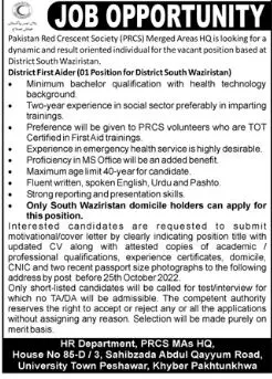 - Pakistan Red Crescent Society PRCS invites applications for job positions advertised in daily Aaj dated 15 October 2022 for following vacancies in Peshawar, peshawar Khyber Pakhtunkhwa KPK Pakistan.