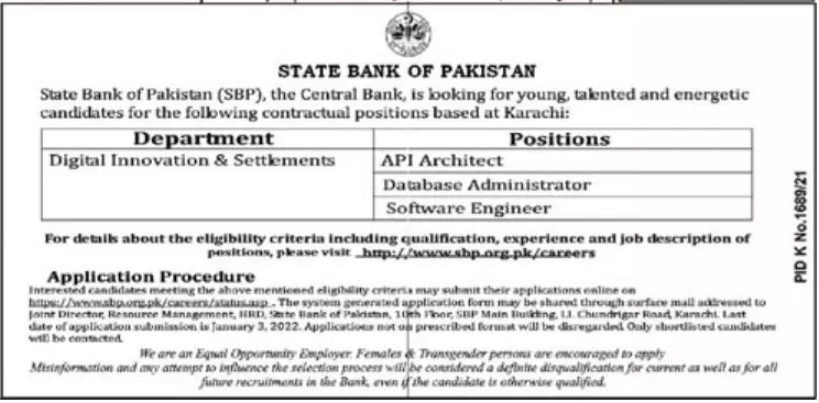 Jobs in Pakistan The State Bank of Pakistan Karachi announce the Contract career opportunities for the post of See Below Ad in Sindh,Karachi for the fresh and experienced candidates on Contract basis who have Check Advertisement degree. Posted date of this post is 20/12/2021 and the last date is 03/01/2022. if you are eligible for this job apply before due date.