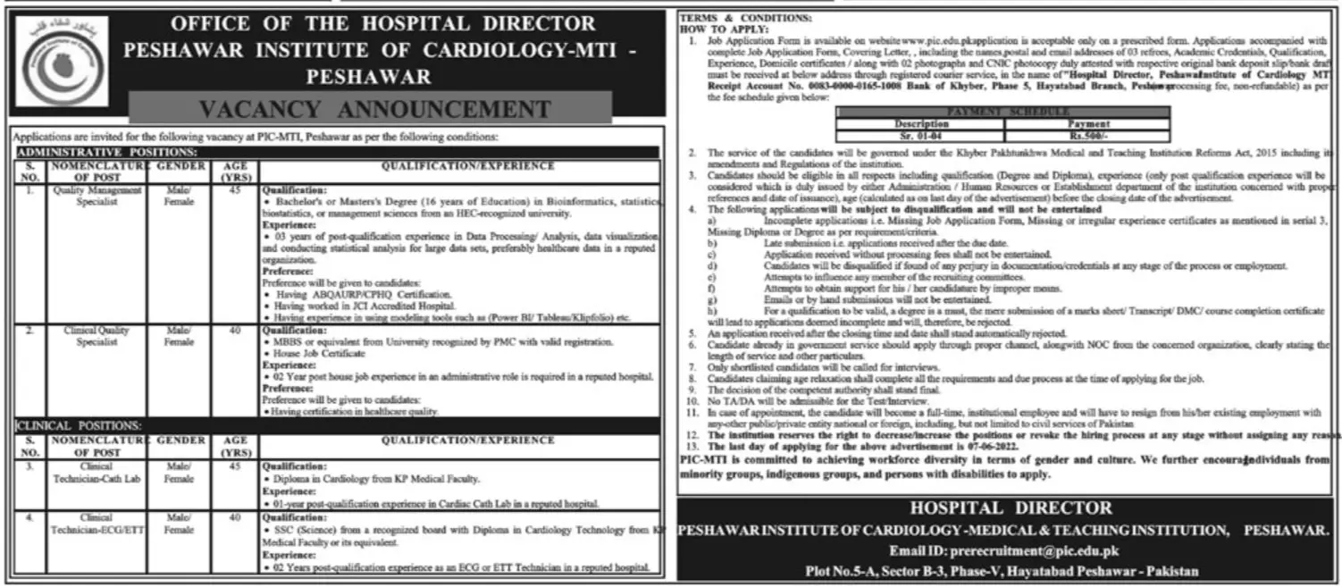 Jobs in Peshawar Institute of Cardiology MTI Peshawar announce the Contract career opportunities for the post of See Below Ad in Khyber Pakhtunkhwa, Peshawar for the fresh and experienced candidates on Contract basis who have Check Advertisement degree. Posted date of this post is 25/05/2022 and the last date is 07/06/2022. if you are eligible for this job apply before due date.