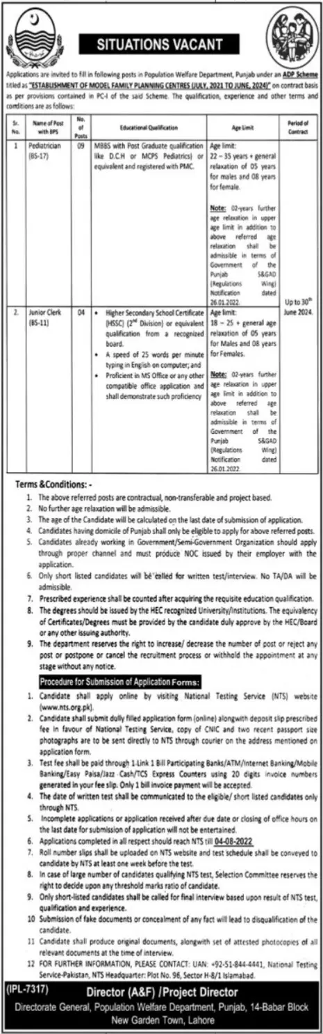 Jobs in Population Welfare Department Lahore Punjab announce the Contract career opportunities for the post of See Below Ad in Punjab, Lahore for the fresh and experienced candidates on Contract basis who have Check Advertisement degree. Posted date of this post is 25/07/2022 and the last date is 04/08/2022. if you are eligible for this job apply before due date.
