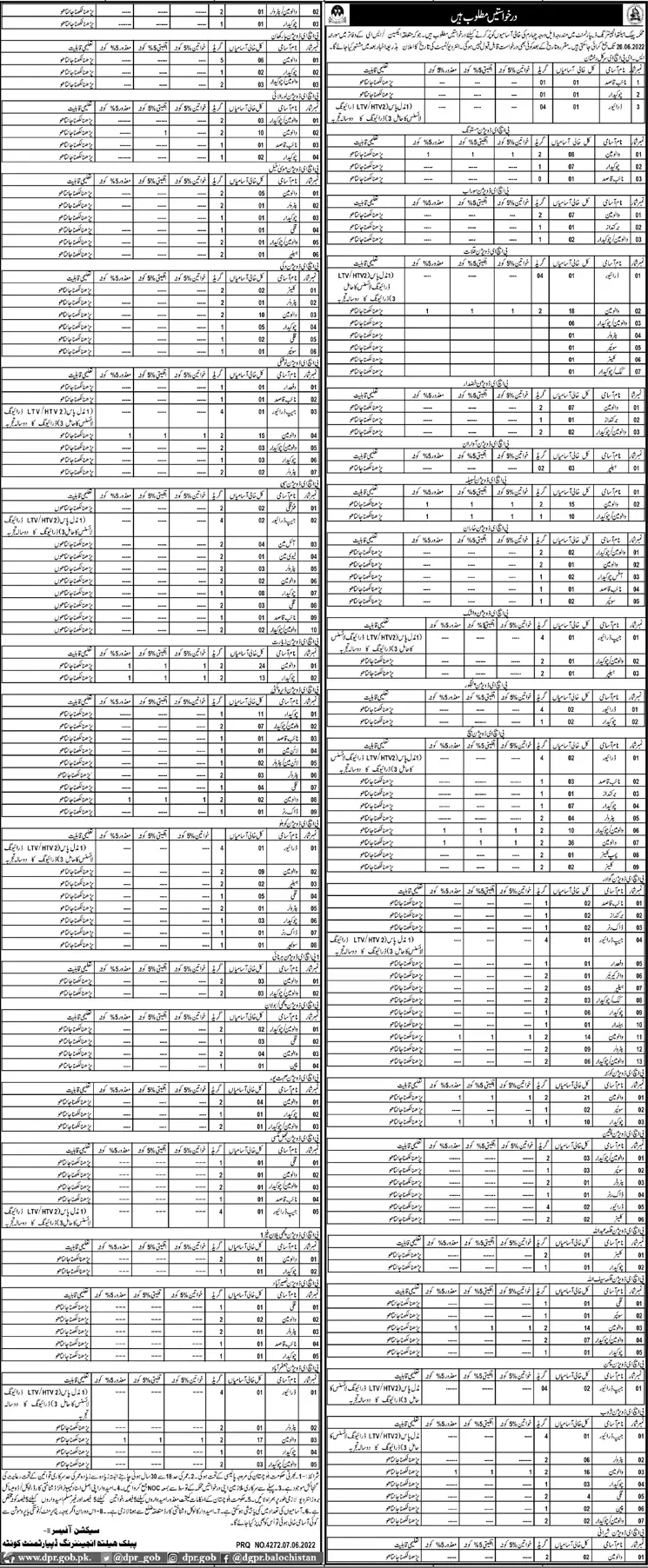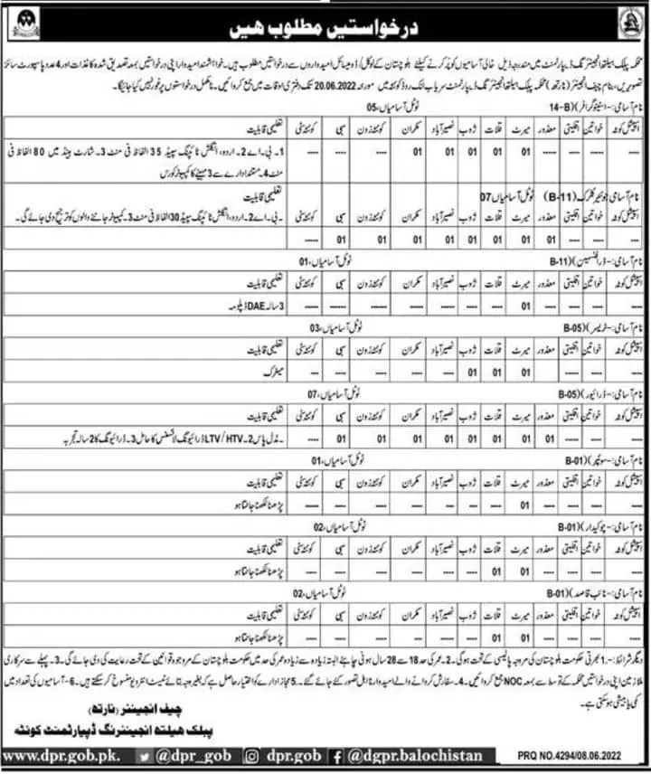 Jobs in Public Health Engineering Department Balochistan announce the Permanent career opportunities for the post of See Below Ad in Balochistan, Quetta for the fresh and experienced candidates on Permanent basis who have Check Advertisement degree. Posted date of this post is 08/06/2022 and the last date is 20/06/2022. if you are eligible for this job apply before due date.