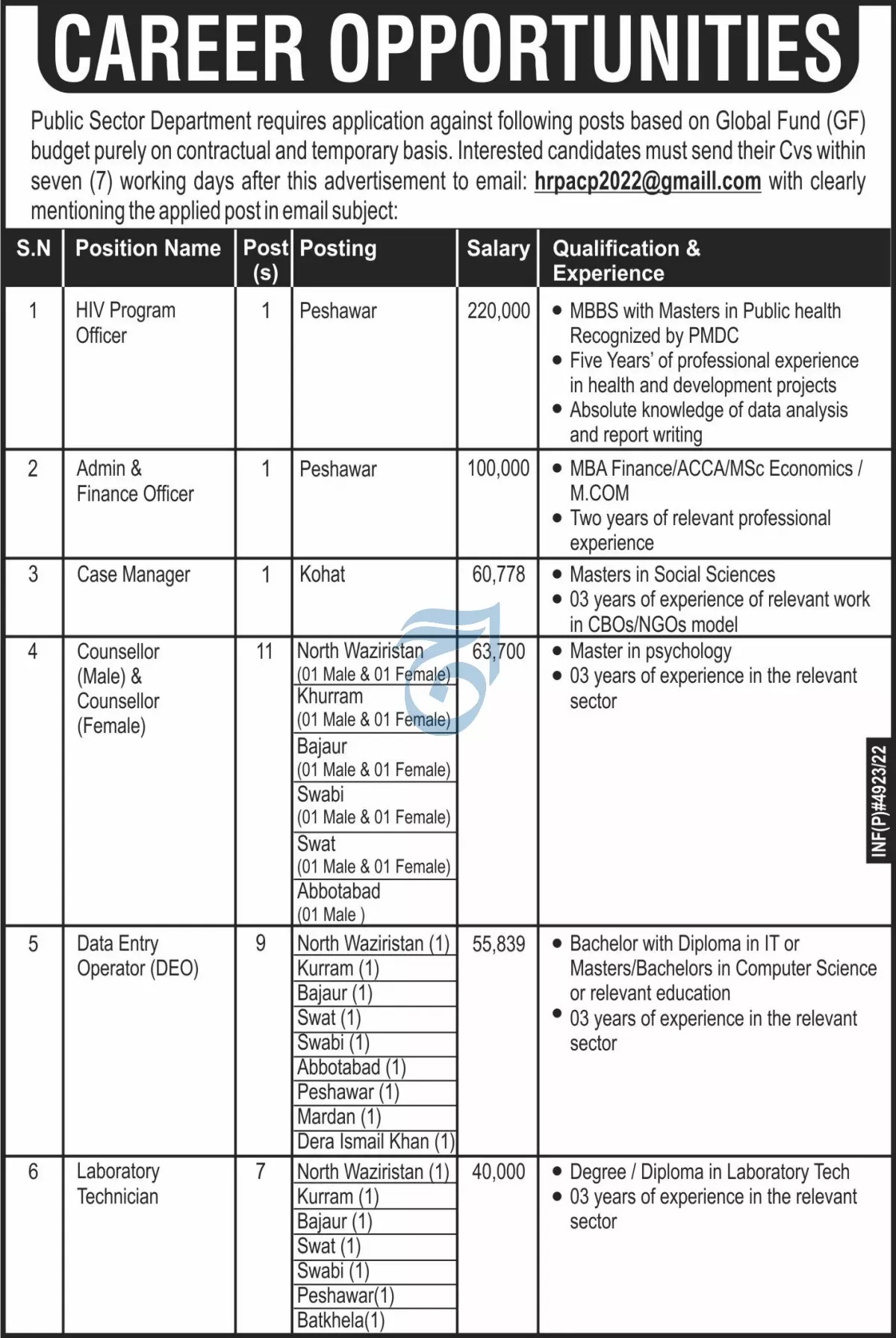 Jobs in Public Sector Department Khyber Pakhtunkhwa 2022 announce the Contract career opportunities for the post of See Below Ad in Khyber Pakhtunkhwa, Peshawar for the fresh and experienced candidates on Contract basis who have Check Advertisement degree. Posted date of this post is 25/08/2022 and the last date is 31/08/2022. if you are eligible for this job apply before due date.