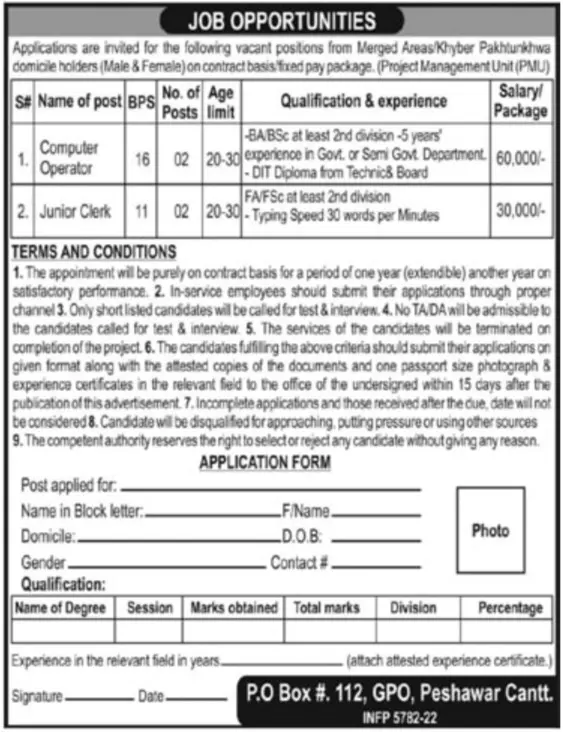 Jobs in Public Sector Organization Peshawar Cantt announce the Contract career opportunities for the post of See Below Ad in Khyber Pakhtunkhwa, Peshawar for the fresh and experienced candidates on Contract basis who have Check Advertisement degree. Posted date of this post is 06/10/2022 and the last date is 21/10/2022. if you are eligible for this job apply before due date.