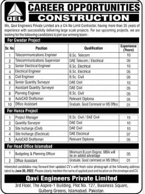 Jobs in Qavi Engineers Pvt Limited announce the Contract career opportunities for the post of See Below Ad in Federal, Islamabad for the fresh and experienced candidates on Contract basis who have Check Advertisement degree. Posted date of this post is 19/06/2022 and the last date is 30/06/2022. if you are eligible for this job apply before due date.