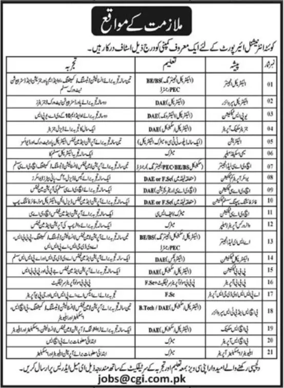 - Quetta International Airport Quetta, quetta Balochistan Pakistan invites applications from eligible candidates for the post of helper, bhs operator, generator mechanic operator, pbb operator, ups technician, boiler operator cum technician, hvac lead engineer, fire fighting pumping system cum technician, electrical supervisor, electrician, hvac technician, asi lead engineer, pbb technician, supervisor, electrical engineer and electrical technician as per advertisement of September 23, 2022 published in daily Jang Newspaper. Bachelor, Intermediate, Middle and Matric etc. educational qualification will be preferred.