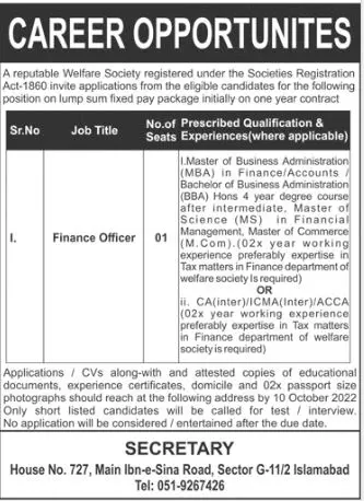 Jobs in Reputable Welfare Society Islamabad 2022 announce the Contract career opportunities for the post of See Below Ad in Federal, Islamabad for the fresh and experienced candidates on Contract basis who have Check Advertisement degree. Posted date of this post is 25/09/2022 and the last date is 10/10/2022. if you are eligible for this job apply before due date.
