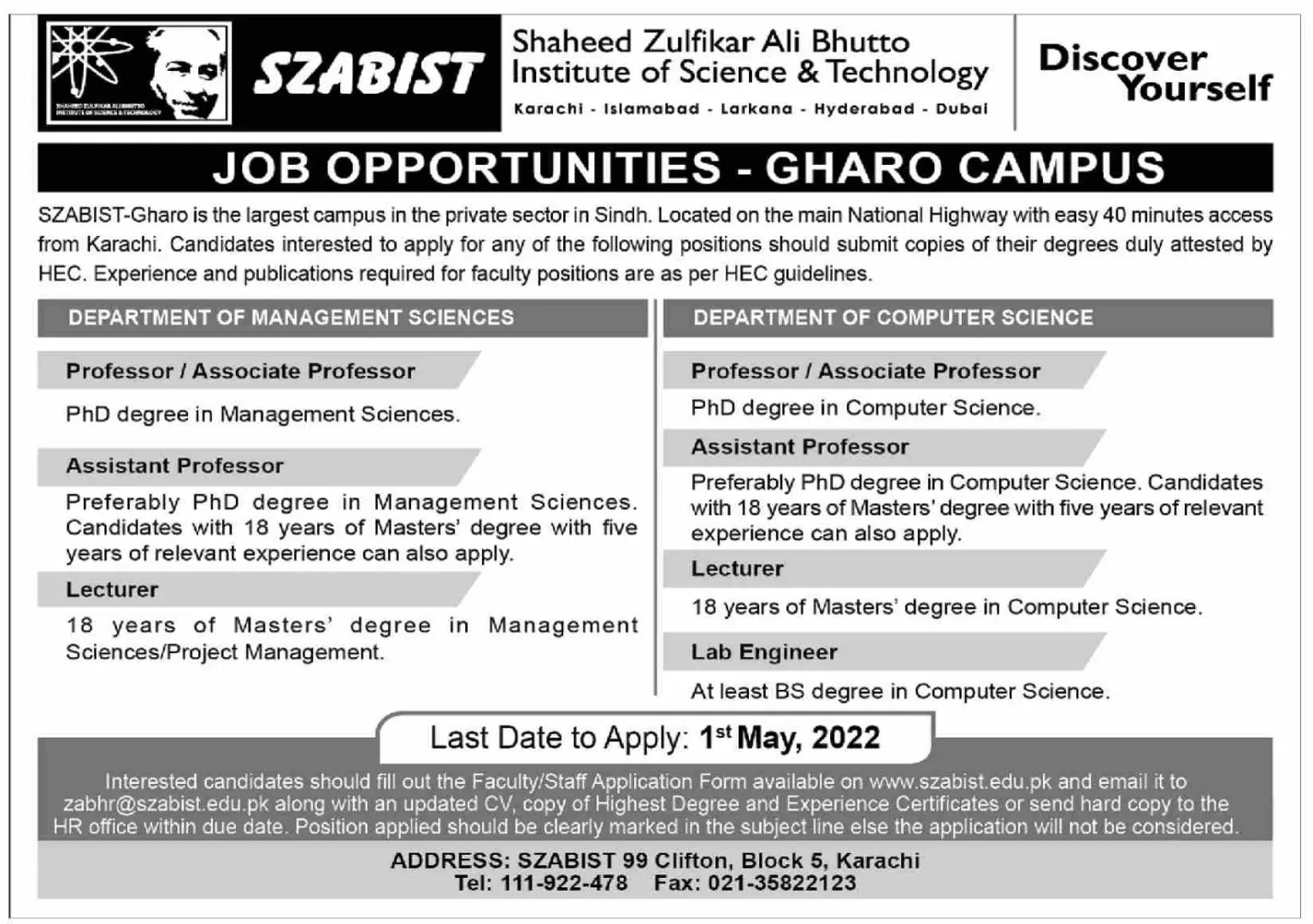 jobs in Shaheed Zulfikar Ali Bhutto Institute of Science announce the Contract career opportunities for the post of See Below Ad in Sindh, Karachi for the fresh and experienced candidates on Contract basis who have Check Advertisement degree. Posted date of this post is 26/04/2022 and the last date is 01/05/2022. if you are eligible for this job apply before due date.