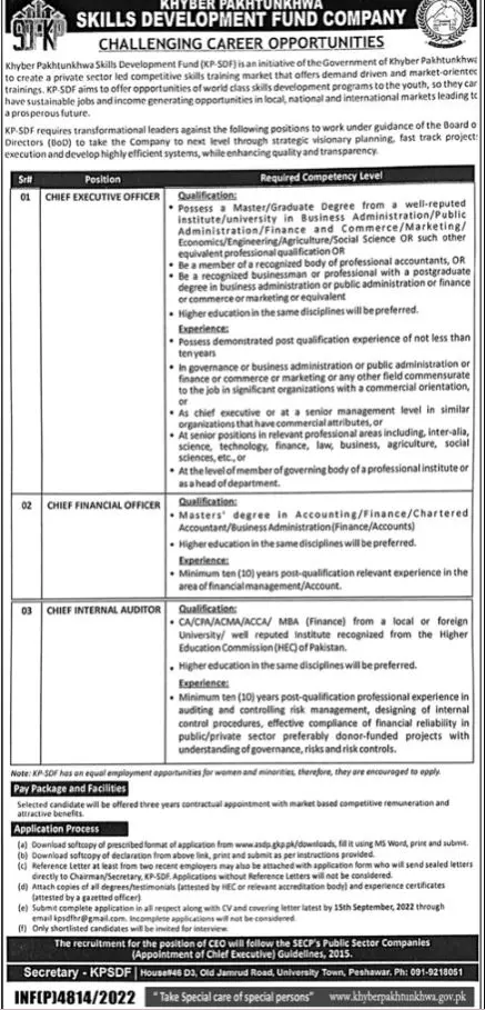 - Vacant posts including cfo, chief executive officer, ceo, chief internal auditor and chief financial officer are announced in Khyber Pakhtunkhwa Skill Development Fund Peshawar, peshawar Khyber Pakhtunkhwa KPK Pakistan as per 21 August 2022 advertisement in daily Aaj Newspaper.