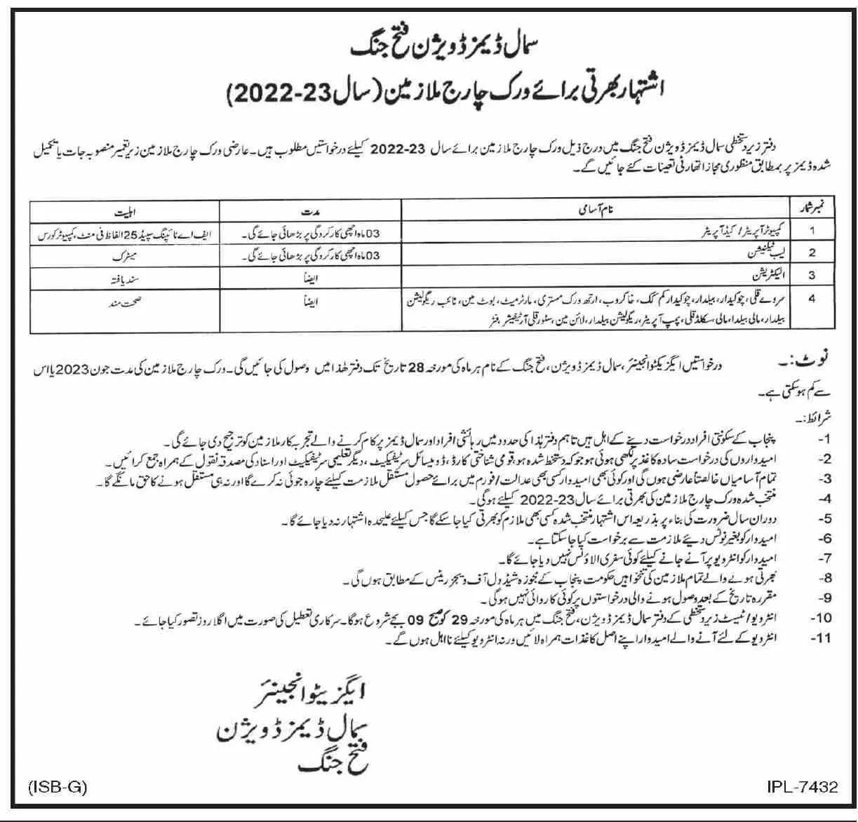 Jobs in Small Dams Division irrigation Department announce the Contract career opportunities for the post of See Below Ad in Punjab for the fresh and experienced candidates on Contract basis who have Check Advertisement degree. Posted date of this post is 21/07/2022 and the last date is 28/07/2022. if you are eligible for this job apply before due date.