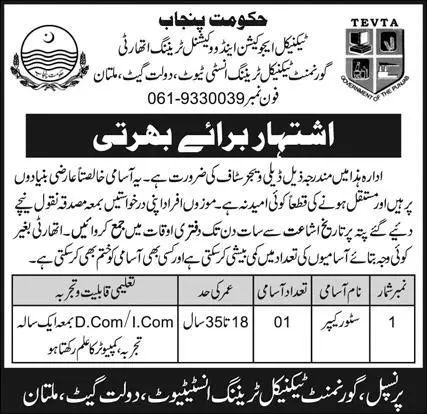 Jobs in Technical Education & Vocational Training Authority announce the Contract career opportunities for the post of See Below Ad in Punjab, Multan for the fresh and experienced candidates on Contract basis who have Check Advertisement degree. Posted date of this post is 03/10/2022 and the last date is 16/10/2022. if you are eligible for this job apply before due date.