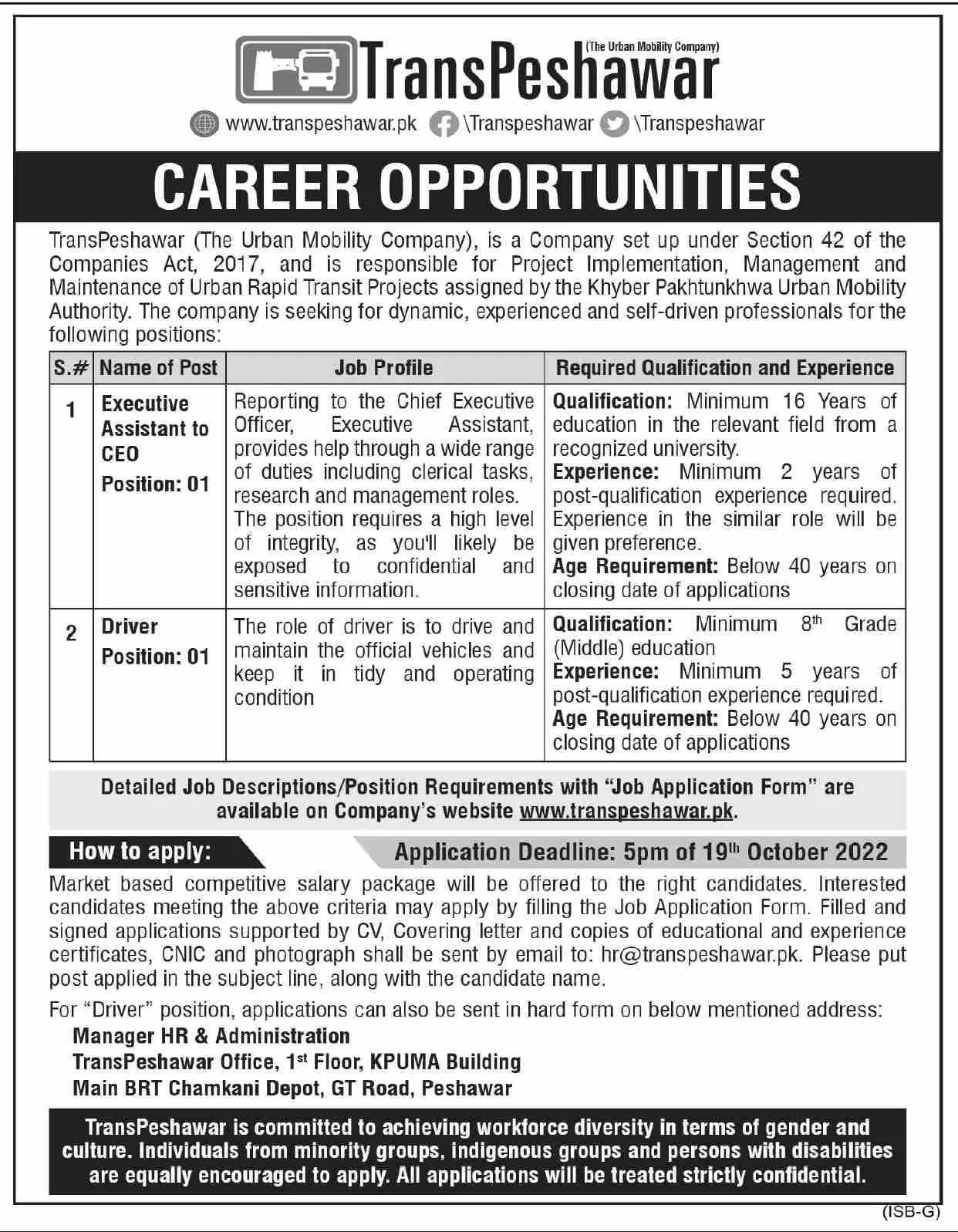- Apply at TransPeshawar latest Government jobs in Executive and departments before closing date which is around October 19, 2022 or as per closing date in newspaper ad.