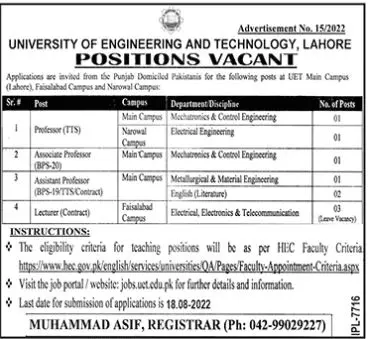 Apply at University of Engineering and Technology UET latest Private jobs in Teaching and departments before closing date which is around August 18, 2022 or as per closing date in newspaper ad.