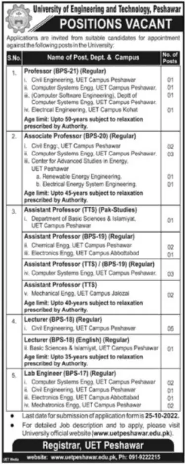 - The UET Peshawar Advertisement is seeking applications from highly qualified, committed, and dynamic professionals for the appointment of Professors, Associate Professors, Assistant Professors, Lecturers, and Lab Engineers.