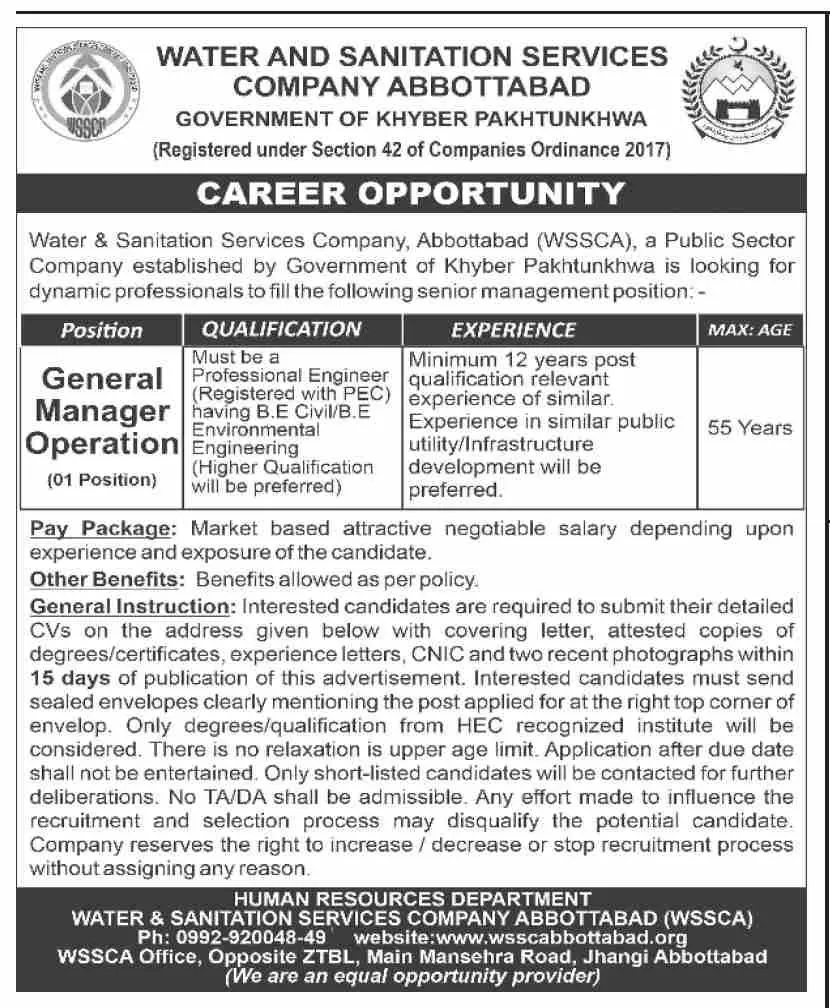 Jobs in Water And Sanitation Services Company Abbottabad announce the Contract career opportunities for the post of See Below Ad in Khyber Pakhtunkhwa, Abbottabad for the fresh and experienced candidates on Contract basis who have Check Advertisement degree. Posted date of this post is 17/06/2022 and the last date is 02/07/2022. if you are eligible for this job apply before due date.