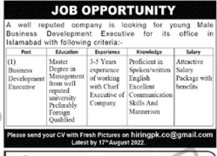 Jobs in Well Reputed Company announce the Contract career opportunities for the post of See Below Ad in Federal, Islamabad for the fresh and experienced candidates on Contract basis who have Check Advertisement degree. Posted date of this post is 01/08/2022 and the last date is 17/08/2022. if you are eligible for this job apply before due date.