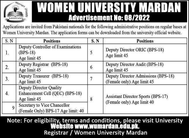 - According to the given criteria, applicants who have Bachelor’s Degree, Master’s Degree, MS, M.Phil, or equivalent qualifications can send applications to get recruited. Candidates can get complete eligibility terms and conditions at www.wumardan.edu.pk.