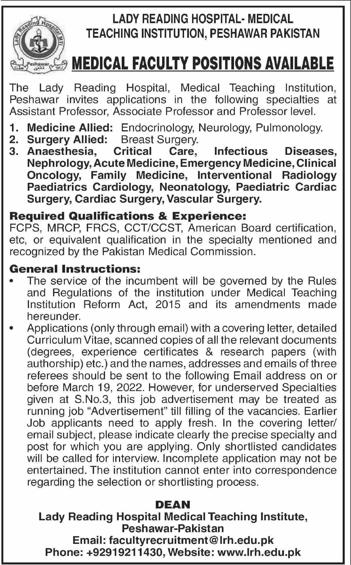 Jobs Lady Reading Hospital MTI Peshawar 2022 announce the Contract career opportunities for the post of See Below Ad in Khyber Pakhtunkhwa,Peshawar for the fresh and experienced candidates on Contract basis who have Check Advertisement degree. Posted date of this post is 05/03/2022 and the last date is 19/03/2022. if you are eligible for this job apply before due date.