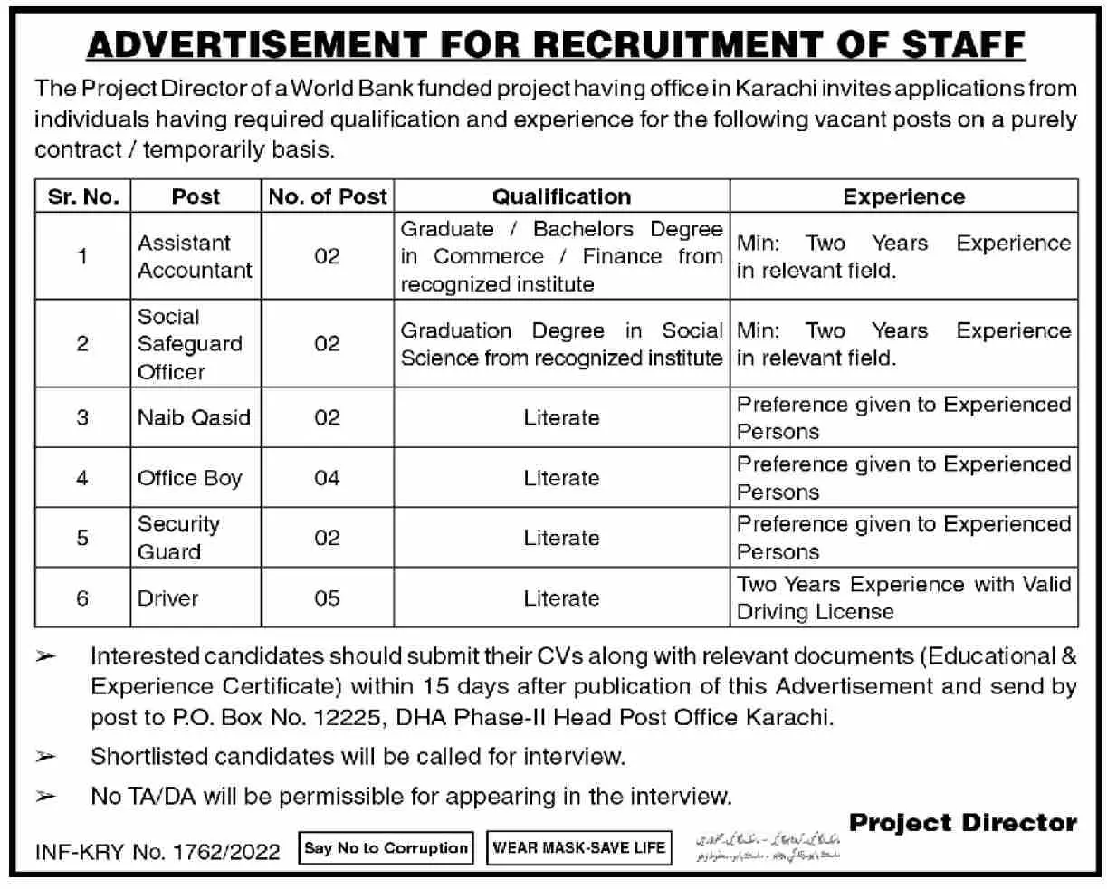 Jobs world Bank Funded Project Office Karachi announce the Contract career opportunities for the post of See Below Ad in Sindh,Karachi for the fresh and experienced candidates on Contract basis who have Check Advertisement degree. Posted date of this post is 08/04/2022 and the last date is 23/04/2022. if you are eligible for this job apply before due date.