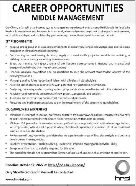 - Education can apply. Apply at Human Resource Solution International HRSI latest Private jobs in Management and departments before closing date which is around October 2, 2022 or as per closing date in newspaper ad.